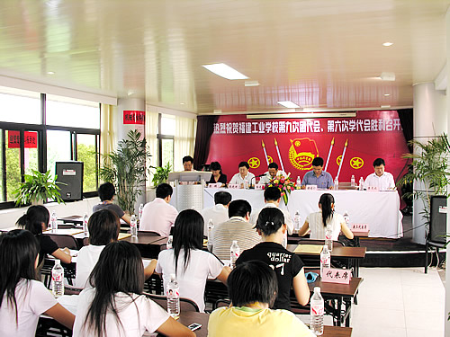 2007年5月27日上午,我校第九次团代会、第六次学代会在校图书馆五楼隆重召开。出席本次会议的领导和来宾有:省教育厅直属单位团委书记谢福仁同志,厅团委委员、机关团支部书记张晓明同志,校党总支书记、校长杨运齐同志,副校长陈天水同志,副校长陈礁同志、以及学生科副科长郭辉老师,校团委书记刘坛华老师和各专业科团总支书记。大会在庄严的国歌声中开幕,杨运齐校长致开幕词,谢福仁同志发表了讲话。共计100余名学生代表认真听取并审议了刘坛华老师代表第八届团委会的工作报告,及张燕玲同学代表第五届学生会的工作报告。代表们举手表决通过选举办法、总监票人、唱票人、记票人名单后,经过慎重考虑,进行了投票,从21名团委候选人中选出了19名团委委员,从38名学生会候选人中选出了18名学生会委员。主持人接着宣读了“践行社会主义荣辱观、共创和谐文明校园”倡议书。本着“公平、公正、公开”的原则,在紧张而有序的唱票及统计工作后,主持人受总监票人委托宣布了选举结果。戴贵福同学作为新一届两委委员代表发表了讲话。最后,陈天水副校长为大会致闭幕词,全体起立歌唱中国共青团团歌,本次大会在热烈而隆重的气氛中圆满结束。