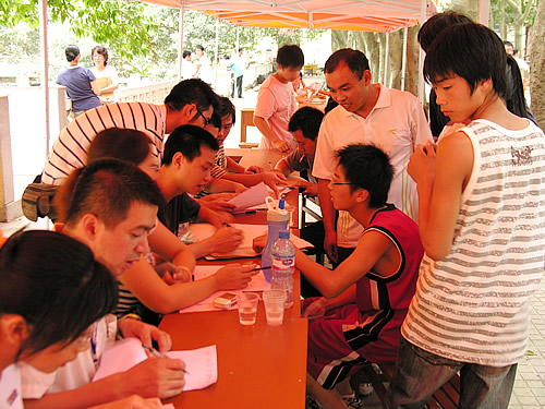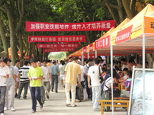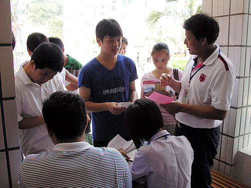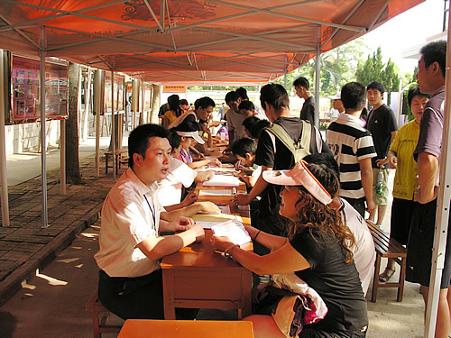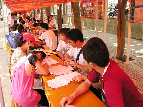 昨天傍晚的细雨为朝阳中的校园增添了些许清新翠绿,校门口新建设的景观水池在清晨的阳光中闪现着点点光彩,校道两旁红旗招展向远道而来的学生和家长们表示热烈的欢迎。校门口、教学楼前的大幅展版和图书馆的电子屏幕上对新生的报道流程都做了简洁明了的介绍。各专业科次序排开,并专门针对新生制作了专业特色鲜明的展板和宣传材料,使学生对将要学习的专业有一个初步了解。同时安排学长举着本专业的引导牌,方便家长和学生更快的找到所要报到的专业。咨询接待组、班主任老师也早早到达了位置,架好遮阳帐篷,准备好各种资料和宣传单页,方便学生和家长的咨询。后勤保障组的工作人员为家长和学生准备了解暑的菊花茶,医务人员也在医务室里待命,应对突发情况。
