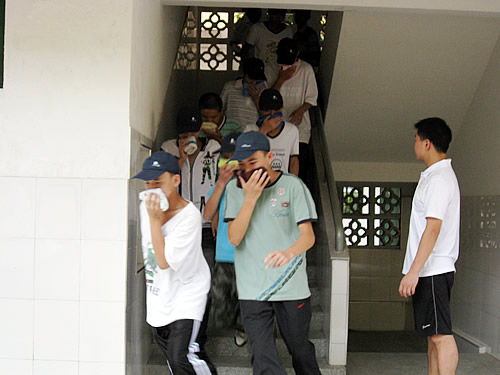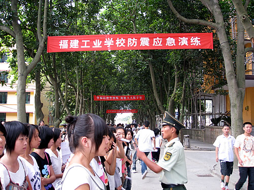 这是我校新生军训方案中安排的一项特别内容,也是新学期安全教育的第一节课。9月1日,学校组织全体新生观看了中央电视台在开学第一天播出的“让知识守护生命”的专题片,此片在我校师生中引起了强烈的反响,保护生命从未在大家的意识中显得如此重要。学校领导班子决定,在每学年开学初都要组织新生进行一次防震、防火应急疏散演练,通过演练,教会学生基本逃生自救的技能和方法,保障学生的生命安全。
