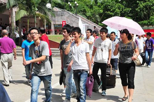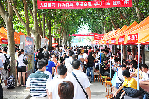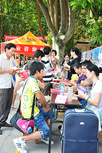 上午10点,迎来了新生报到的高潮,校道上人山人海。虽然酷暑难耐,天气闷热,但是工作人员还是以高度的责任感和良好的服务态度投入到迎新工作中,赢得学生、家长的一致好评。