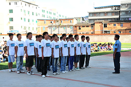 我校2010级新生于8月25日至9月3日进行了为期十天的军训及养成教育活动,9月3日下午3时30分,新生军训会操表演大会在田径场隆重举行。大会由鞠建明调研员主持,杨运齐校长、戴雄强副校长、94647部队领导、2010级新生班主任及学生管理老师参加了军训会操表演大会。