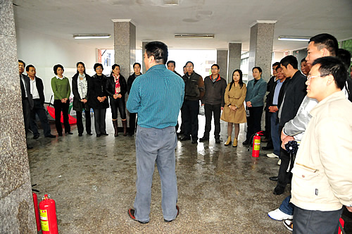 演练现场数十个手提式干粉灭火器一字排开,模拟着火点的两个大铁桶布置在空旷的后山区域,铁筒上架起柴火堆,灌上了汽油,火焰熊熊燃烧。杨运齐校长作了华体会平台消防安全演练的动员讲话,指出“防火防灾,人人有责”,号召全体师生要树立“生命至上,安全第一”的意识,所有的中层以上干部要带头严于律己,以身作则,在全体教职员工中做好表率作用,大家齐心协力,共创一个平安、和谐的校园。安全保卫科的郭辉副科长就灭火器的种类、如何辨别合格的灭火器、灭火器的具体使用方法、灭火过程中的注意事项等进行了详细的介绍。他边讲解边动手示范,同时结合发生火灾的案例,警醒各位教师不仅要认真学习消防灭火的常识,在关键时刻更需要保持镇定。还特别提示,办公室容易引起火灾的常见火源如未完全熄灭的烟头、使用频繁的办公电器等都需要时时警惕,时时检查,时时留意。学校还在校内网上整理发布了消防安全常识及应急处理时采用的方法,请各位教职工阅读学习。杨运齐校长特别强调水火无情,各位教职员工要切记使用灭火器的正确方法,就是“一拔二握三瞄四扫”。“拔”,即拔掉插销;“握”,即迅速握住瓶把及橡胶软管;“瞄”,即瞄准风向和火焰根部;“扫”,即朝火焰根部左右扫灭。管理实验室的老师更要熟练使用灭火器材。