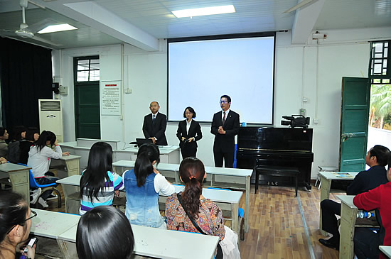 井上隆治、森内徹先生等一行向我校学生介绍此行与我校开展国际交流,进行“高中阶段留学生项目”的具体情况