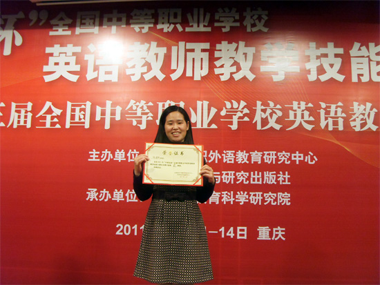 2011年11月12-13日,我校经贸专业教学部游建丽老师在由全国中职外语教育研究中心和外语教学与研究出版社联合举办的“外研社杯”全国中等职业学校英语教师教学技能大赛总决赛中荣获二等奖。
