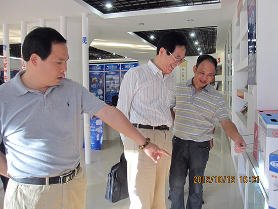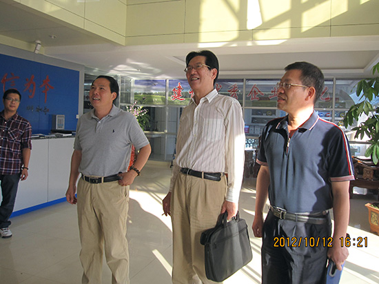 杨启东董事长(左)为戴雄强副校长(右一)、林克恩老校长(中)介绍奇东公司的企业文化