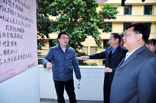 图为省教育厅学校安全工作处谢友平处长(右一)正在检查我校安全教育宣传工作。