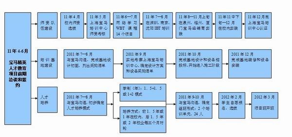 宝马精英人才教育项目早在2005 年就开始启动了,其不仅能培养大量的服务于宝马公司的优秀员工,还能够大力支持地方职业教育。已先后与南京、辽宁等地4所职业技术学院合作,我校经过宝马中国培训学院领导、专家4轮的评估、考核和洽谈,成为宝马在全国第5所合作院校(也是该公司在福建省唯一的合作院校),目前项目已进入实施阶段,项目进展如下图所示:
