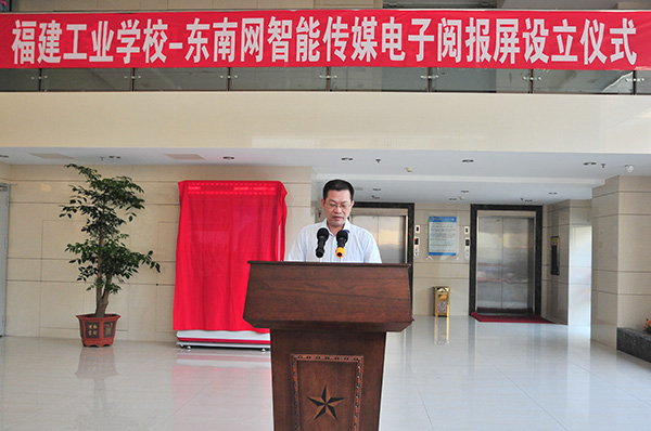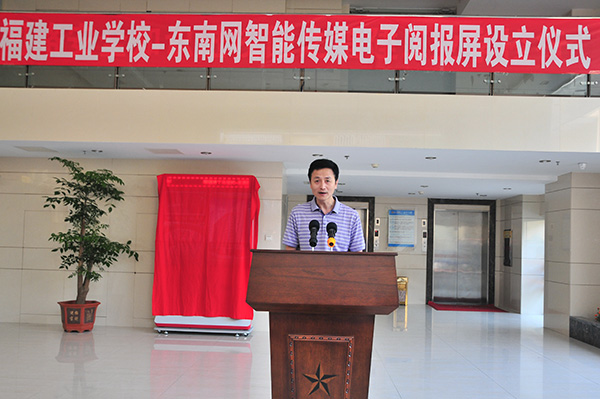 仪式上,戴雄强副校长代表学校对到场的来宾表示欢迎并致辞。他说,福建工业学校自1978年创办以来,经过全体师生的不懈努力,在上级正确领导下和社会各界的关心支持下,取得了长足的进步和显著的成绩。我们拥有雄厚的师资力量、先进的教学设备和高端的实训基地,办学质量、竞赛成绩、就业率和升学率等都位居全省前列。学校是首批国家中等职业教育改革发展示范校、首批国家级重点中专、全国职业教育先进单位,未来我们也将继续朝着更高的目标不断探索和努力。他指出,本次由东南网智能传媒管理中心自主研发的电子阅报屏正式进驻我校,打响了东南网福建全省校园铺设计划的第一炮。学校师生可通过这台电子阅报屏查阅最新的华体会网页版资讯、电子报刊、党政要闻等,了解福建各地的风土人情、文化发展、休闲娱乐等方面的内容、信息。最后,他希望双方能以此次活动为契机,寻求更多的合作机会,为广大师生提供更实惠、更便捷的服务。