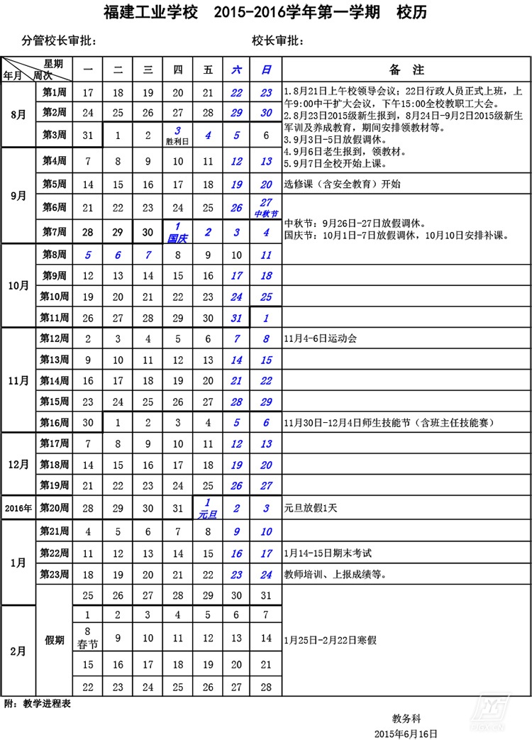 福建工业学校2015-2016学年第一学期教学校历