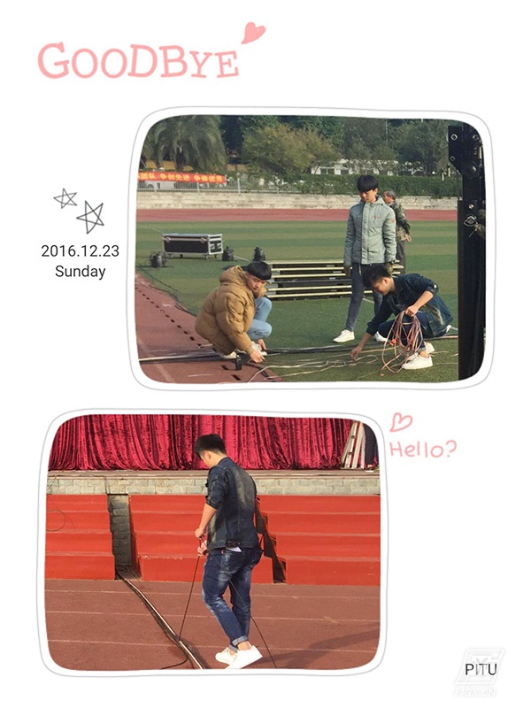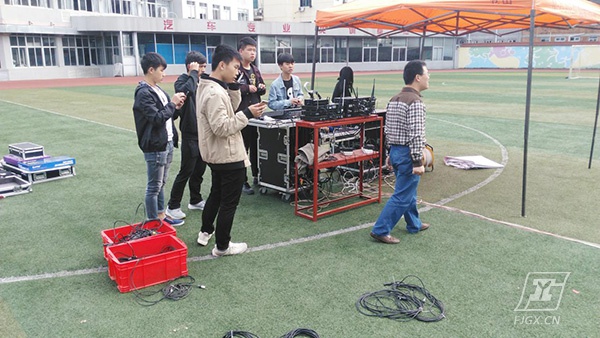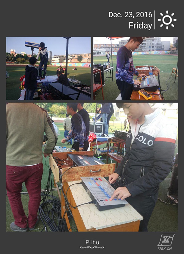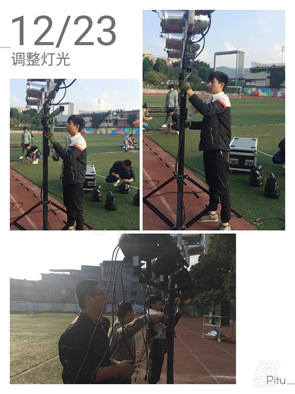 在这成功的背后,很少人会想到台前的精彩是由幕后很多人的辛苦汗水所铸就。台前的表演很精彩,幕后的故事更动人。这一场晚会,我们的所有灯光、音响效果都是有自我服务中心的同学们在林长强老师的带领下完成的。晚会原先预定在12月28日举行,由于天气原因,临时决定提前到23日晚上。20日下午林长强老师带着服务中心的骨干去采购灯光设备,学生们连夜熟悉设备,学习安装、调试。22日上午,他们就开始在田径场上忙碌开了,布线、定位、调试、分工, 每一位同学默默的工作着,没有一句怨言,为打造一场高质量的晚会保驾护航。林长强老师是电气科学生管理副科长,平时工作就非常繁忙,他同时又是自我服务中心的指导老师。为了安排好新采购的设备,为了这场晚会的灯光音响效果,他在田径场上忙碌了整整三天,堪称工校劳模。