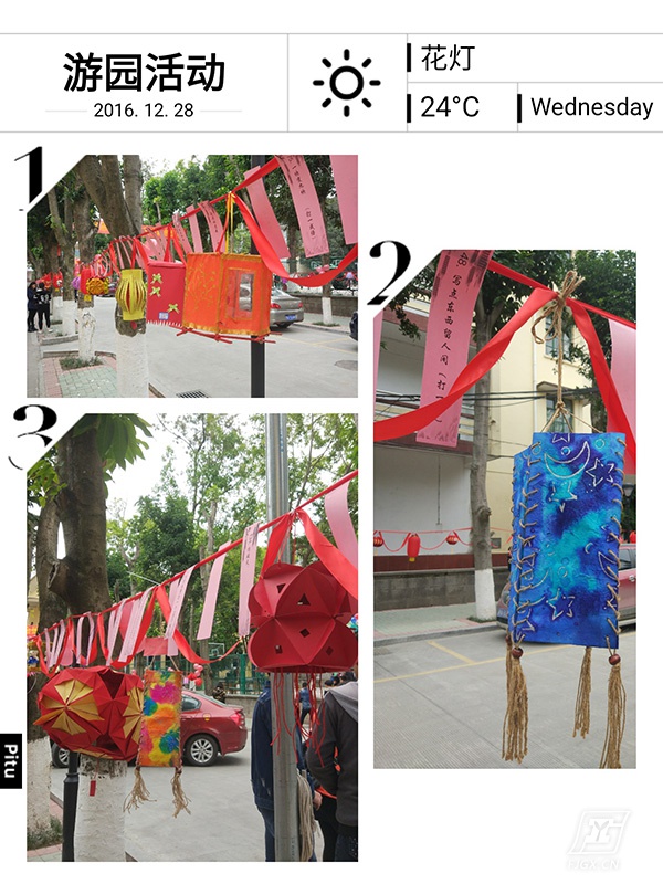 花灯是游园重要的元素之一,有着“一片光明”的寓意。在游园前一周开始,学校发动每个班级制作一盏创意花灯,作为游园的一个评比项目。同学们发挥自己的创意,利用铁丝、一次性筷子、红包、手工纸等制作了各种各样的花灯。老师们纷纷赞叹:“我们的学生手真巧!”