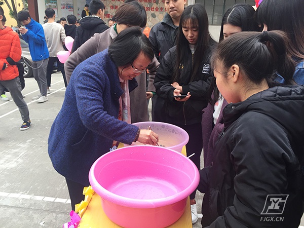 各个活动现场,热情洋溢、笑声不断。“左一点,再右边一点,快敲……”参加“盲人贴五官”的同学们,蒙上双眼,8米开外,在众人的“怂恿”下缓缓走向终点。有的走近了,有的走偏了,有的贴左了贴右了,贴啊贴,怎么也贴不好;“夹珠子”现场,同学们用筷子在水中捞了捞,怎么也夹不起来玻璃弹球,真是心急吃不了热豆腐.....每通过一个项目,工作人员就会给获胜者送上一张奖券,不一会儿,领奖区就排起了长长的队伍。