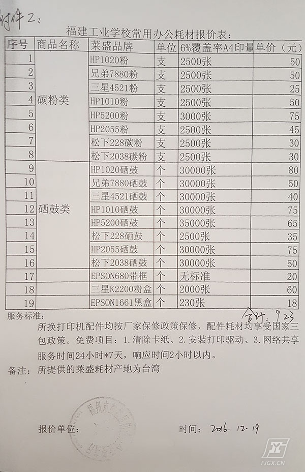 学校招标小组根据招标文件要求,对符合我校办公设备参数且不超过预算最高单价的三家投标方文件进行评议,按十九项单价总和最低价者中标(详见附件1)。