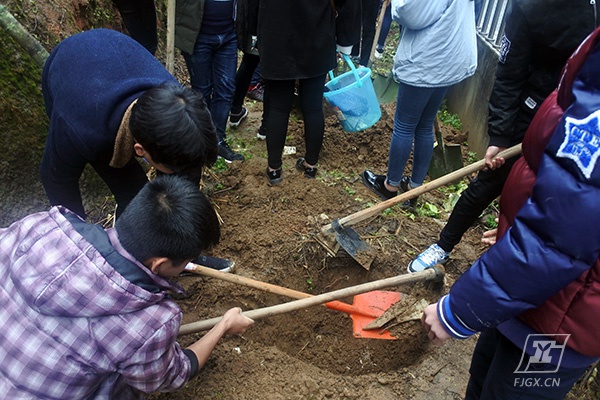 本次活动共有14个班级认领了14棵桂花树,准备栽种在综合楼后的空地上。尽管下着毛毛细雨,但同学们依然热情满满,拿起锄头和铲子,有板有眼地当起了“园艺工程师”。大家分工合作,有的挖坑、有的扶树苗、有的浇水……场面温馨而快乐。在同学们的辛勤劳动下,不一会儿,树苗便“亭亭玉立”在沃土上。虽然大家脚底全是泥土,但眼前这一片新生的春意让大家满心欢喜。