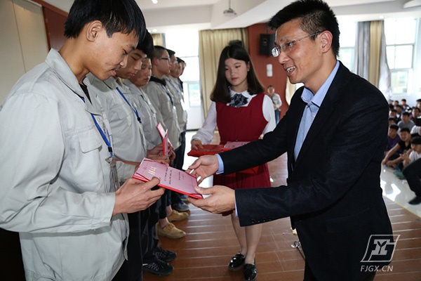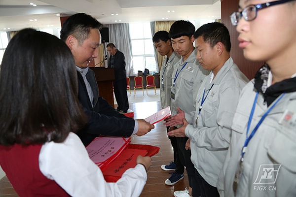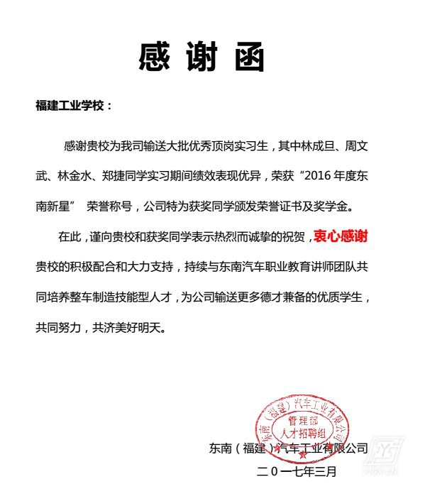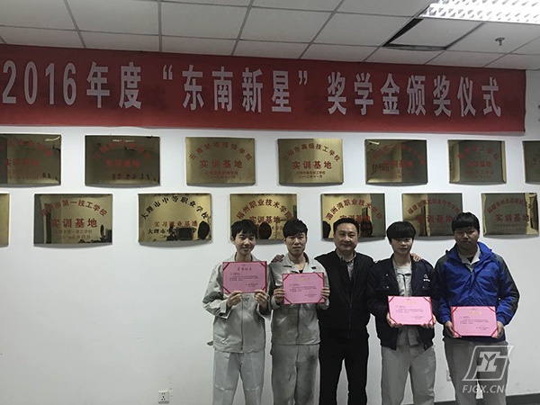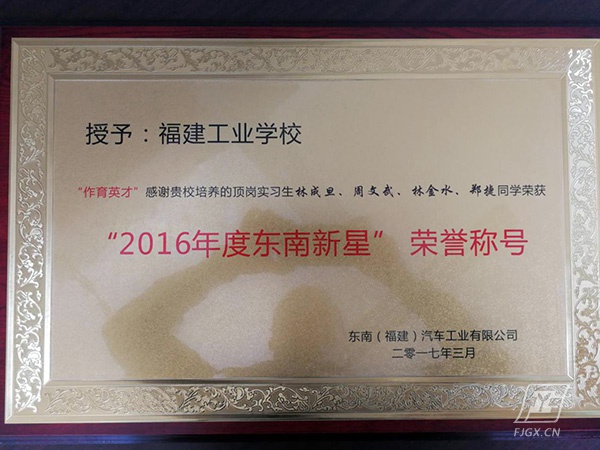 仪式由汽车专业教学部何孟星主任主持,杨尊东副校长代表学校致欢迎词,东南汽车陈逸昌副部长代表企业作重要发言,勉励同学们进一步努力学习,开创职业生涯新局面。2016年学校与东南(福建)汽车有限公司合作办学,订单培养,“双元”教学,成立东南汽车专班,为东南公司输送了一批优秀顶岗实习学生,其中林成旦、周文武、林金水、郑捷同学实习期间绩效表现优异,荣获“2016年度东南新星”荣誉称号。为此在这次颁奖会上,东南公司嘉宾和校领导共同为2015级和2016级两个东南专班共12位品学兼优的同学颁发“东南汽车奖学金”。随后进行了东南汽车授予我校“2016年度东南新星”授匾仪式,以感谢我校为东南汽车公司输送大批优秀毕业生,有力促进企业的不断发展。