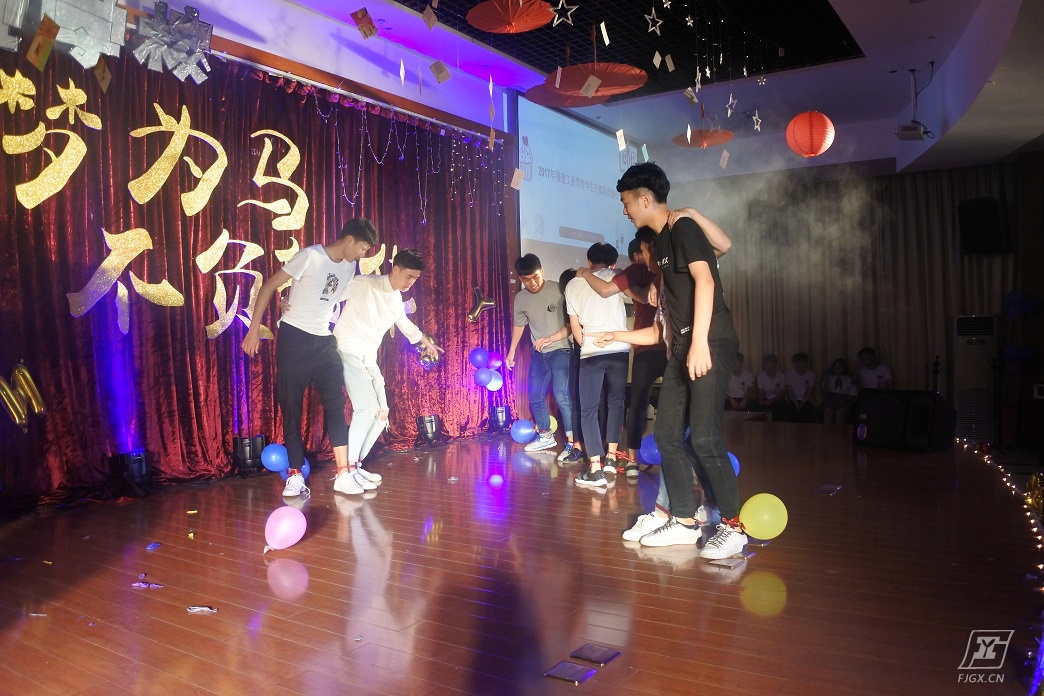 联欢会,除了节目当然少不了游戏了。第一个游戏是《踩气球》。由五个专业教学部、校团委、护校队以及学生社团选出两名代表来参加,现场杀气腾腾,谁都不让谁,场面好不热闹。