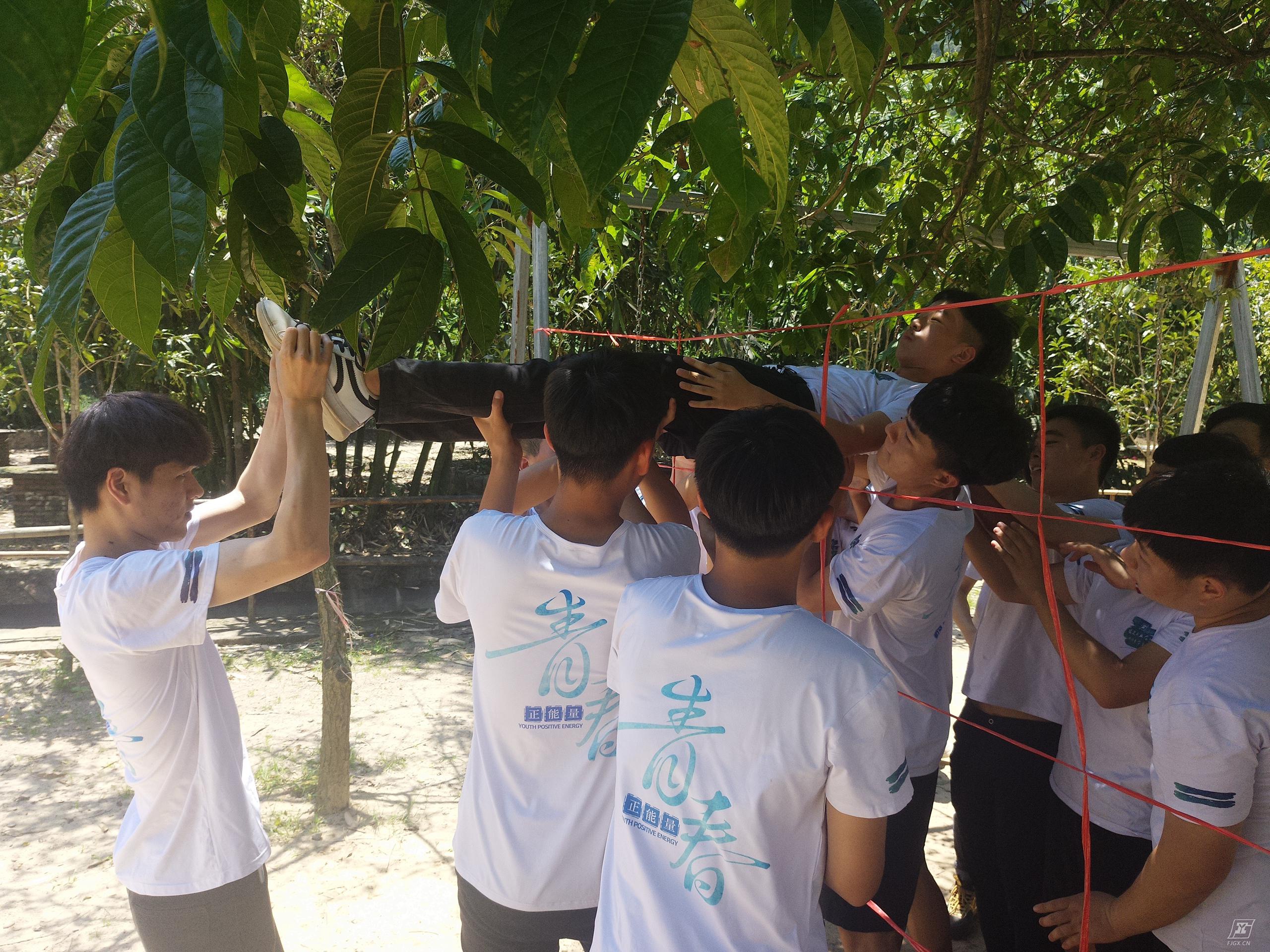紧接着进行的主题游戏——穿越火线,特别考验团队的配合以及耐心。这个游戏要同学们穿越两树之间的格子且每个格子都要穿越。游戏过程非常困难,一次次接近成功,依然失败。同学们坚持不懈,共同加油,才最终完成游戏。