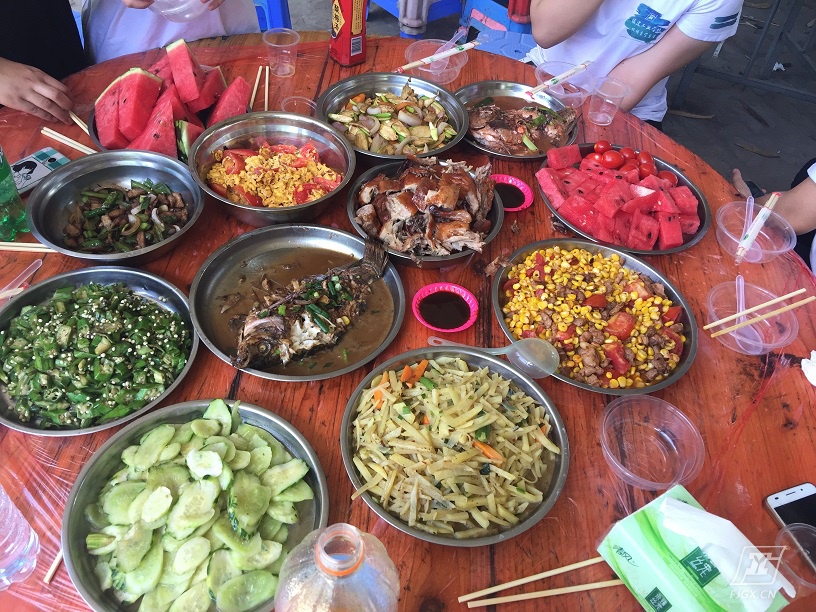 临近中午,终于到了同学们最为期待最为重要的野炊环节。大家搬柴火、洗菜、洗碗,热闹非凡。林宇豪同学与陈星元同学担任主厨,共同操刀完成了一桌丰盛的美味。