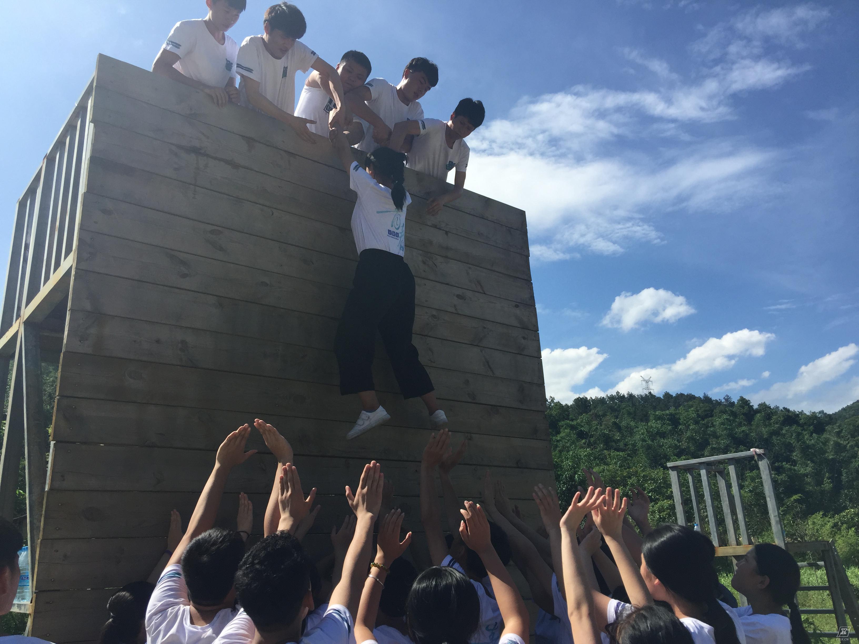 短暂的午休过后,令人难忘的毕业墙到了。墙高四米,要求学生干部们不依靠任何外力,每位同学都要爬上毕业墙。然而这也难不倒学生干部们,他们搭成人梯,一个一个的都顺利翻过了毕业墙,毕业了!