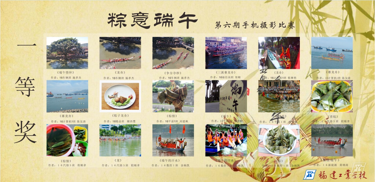 中华民族传统节日是民族文化的宝贵财富,每一个传统节日都蕴涵着独特深层的精神价值观。一年一度的端午节已经有两千多年历史,吃粽子,赛龙舟是端午佳节的传统风俗。福建工业学校团委举办了以“粽爱端午”为主题的第六期手机摄影比赛,让同学们在欢度端午节的同时留下美好的瞬间。这次的手机摄影比赛作品有花样不同、令人垂涎三尺的粽子,还有热血沸腾划龙舟大赛,以及许多来自不同地方独有的端午习俗。一张张美丽的照片下展示的是浓厚悠久的民俗文化。