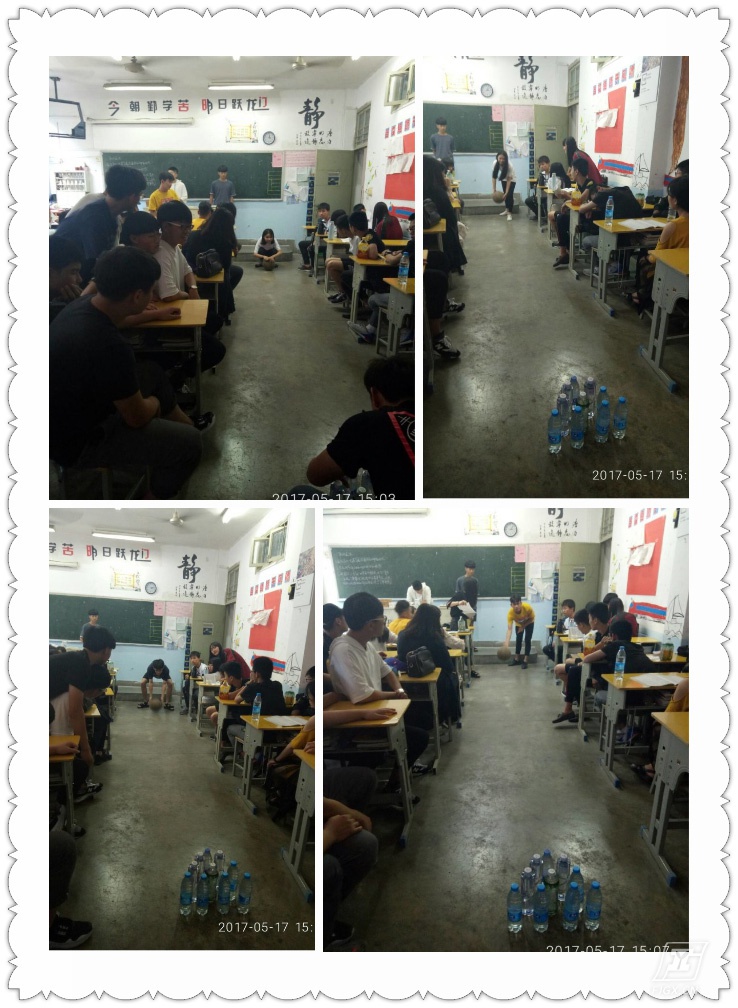 我们还利用每周的德育课举行了很多丰富多彩的活动,有辩论赛、撕名牌、美食、羽毛球、寻宝等。这些活动都是班委组织策划,大家共同完成。开学初,班委集中讨论,组织委员编写策划书,其他同学协助采购相关材料,在每周三下午进行各种活动。活动结束后,我们进行反思总结,以让下一次活动组织更加完善。活动让班级每个同学有了更多的记忆,彼此之间有了更深的感情,从而提高了班级凝聚力。
