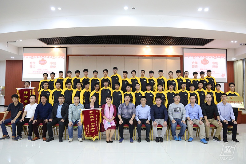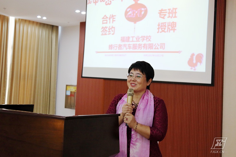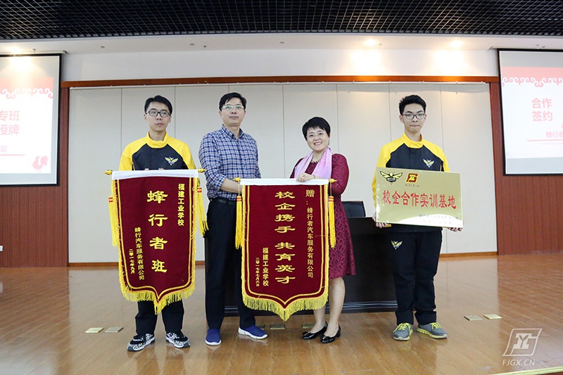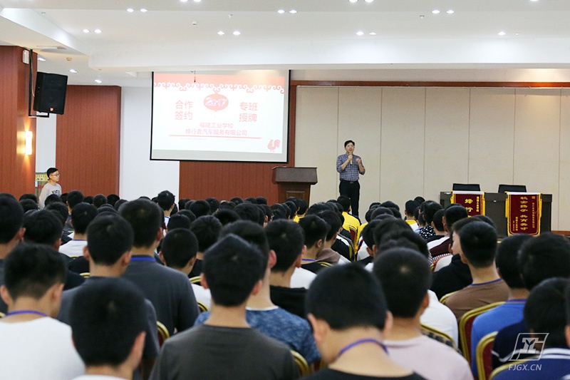 福建工业学校汽车运用与维修专业是国家重点专业,全国交通运输类汽车专业群建设示范专业,国家现代学徒制开展试点专业,与国内众多品牌汽车企业开展校企合作。在我校校领导和汽车专业教学部经过前期的市场调研、合作洽谈的基础上,我校与蜂行者汽车服务有限公司(以下称“蜂行者公司”)达成了合作意向。并于2017年10月27日下午,双方在我校综合大楼报告厅举行校企合作签约暨专班授牌仪式。出席本次活动的有:我校林俊标校长、杨尊东副校长、汽车专业教学部何孟星主任及相关的班主任、专业老师、生管老师、17及汽车运用与维修专业全体学生,蜂行者公司陈正芳总经理、人力部赖雅萍经理和培训部田晓明老师。