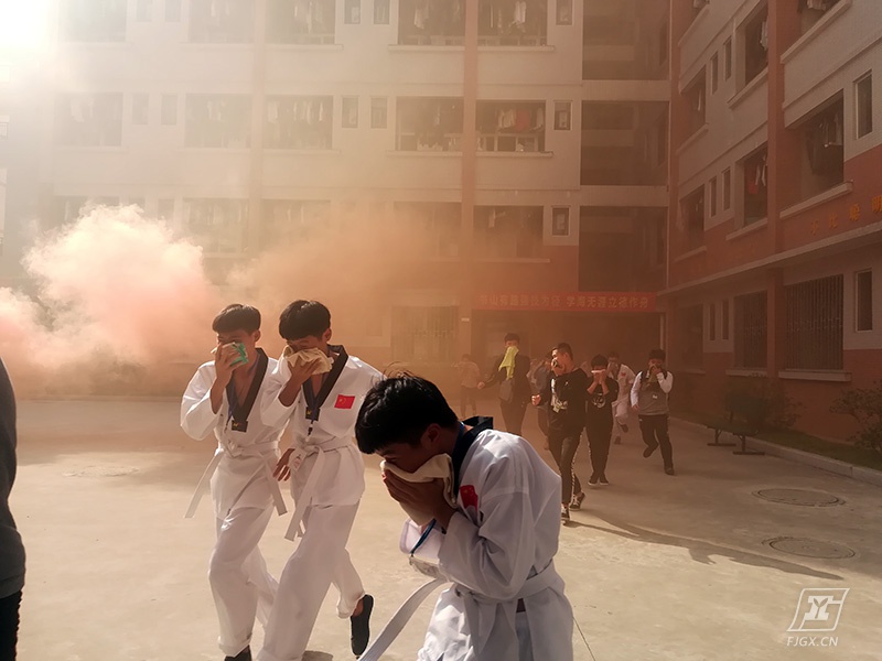警笛响起,同学们用湿毛巾捂住口鼻,弯下腰一个接一个迅速有序的从宿舍里撤出,快速前往指定集合地点,共用时六分钟,整个过程迅速而又有秩序。为使场景更逼真,学校还在宿舍楼下放置了烟雾弹,楼道和指定路线还有教师和站岗同学引导学生迅速疏散。