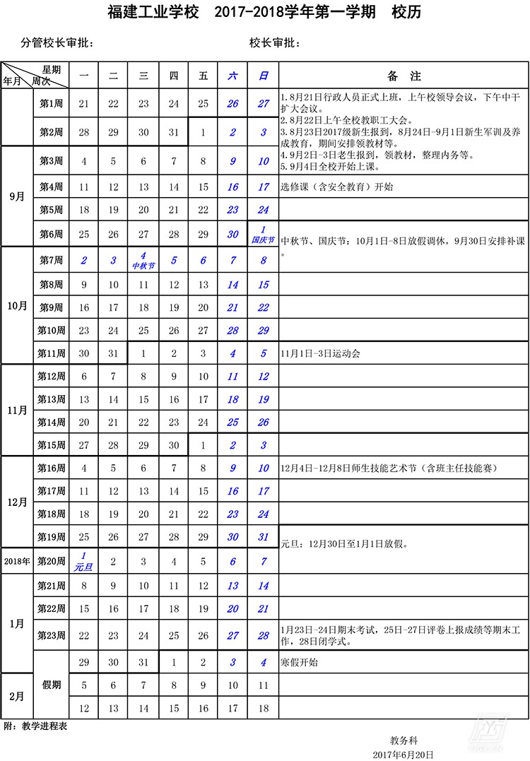 福建工业学校2017-2018学年第一学期教学校历
