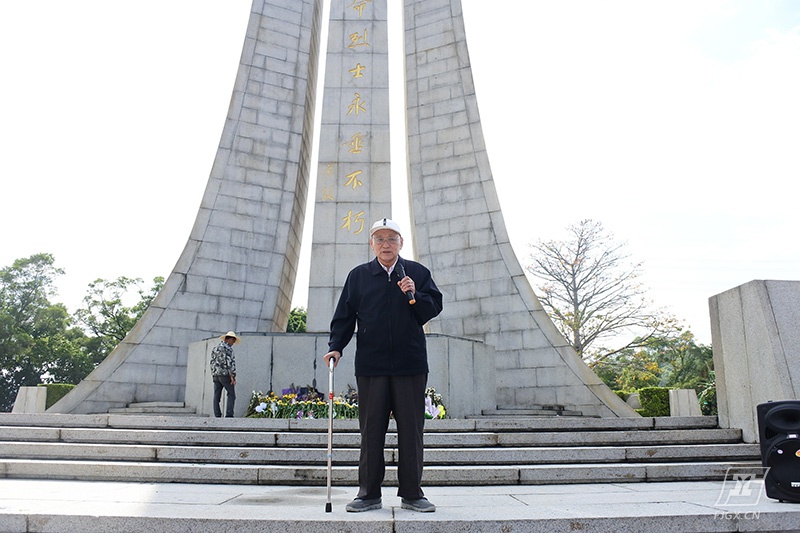 一位拄着拐杖的老人在官兵们的搀扶下走到了同学们的面前,苍劲有力的声音在耳边响起:“我就是在那场战役中的幸存者张福伟。解放后,我始终放不下那牺牲的十八位烈士。当时留下埋葬18位战友的同志也已经音信全无。在那往后的21年里,我走遍了洪山桥附近的每一块地,寻找18位战士遗骸埋葬的地点,可就是找不到。我心底始终无法释怀,我幸运地活了下来,可是牺牲的同志太多,我希望人们不要忘记这18位勇士。直到1973年,我巧遇吴枝花,他是一位老兵,当我说起那件事时,他激动的说:‘我知道,你找我就找对人了。’那18 位战友就埋在吴枝花家屋后的山坡上,我将他们挖出来后重新火化,其中只有三个人确认了身份,并迁到了文林山。那之后,我一直守护着他们,但是我怕我死后他们就被遗忘了。于是我找到了福建工业学校,学校成立了承志班,承担了这份历史使命。一届届的承志班都做的非常好,我感到非常欣慰。”