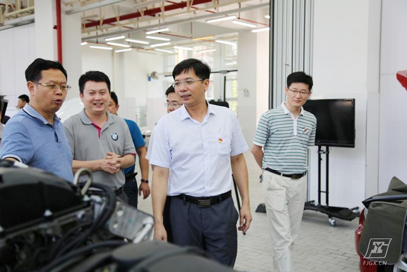 2018年6月11日,湖南东安县县委书记、县长龙向洋领导一行莅临我校参观交流。我校党委书记、校长林俊标同志、叶扬副校长、校办蔡杜娟主任、信息技术中心何孟星主任和林志伟副主任一起陪同参观了信息技术中心,以及汽车实训中心、宝马实训基地等实习实训场。