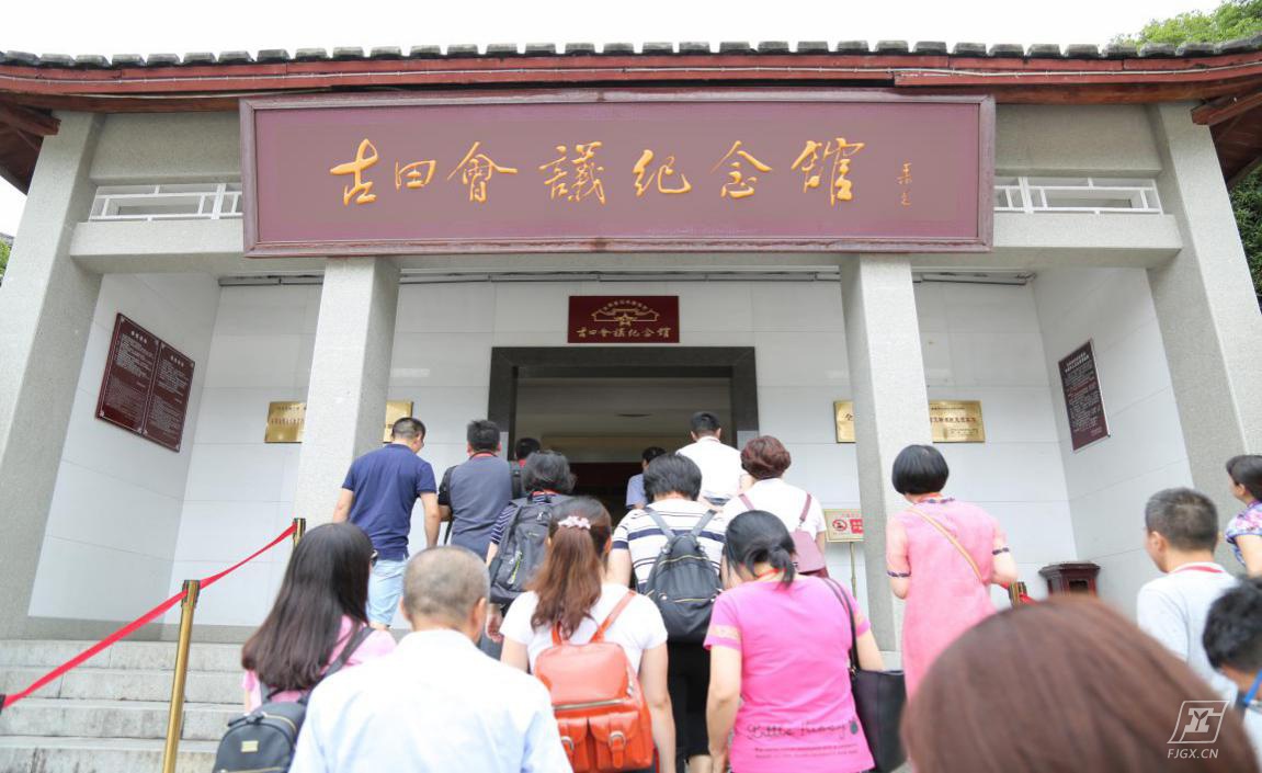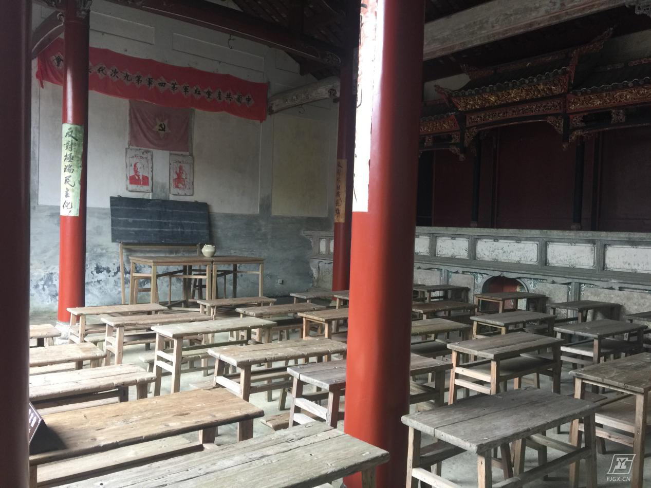 跨过青石大门、进入宽敞的前院,再进入一道红色的木门,就是古田会议会场旧址。6排学生桌椅陈旧而整洁,会场中心的圆柱张贴着“中国共产党万岁”等标语。靠墙架着一块黑板,黑板上方排列着马克思和列宁像。会场右侧厢房第一间,只有一桌二凳,是当年毛主席的临时办公室。就在这简陋的小房间里,毛泽东主席为中国革命指明了正确的道路,引领中国共产党一步一步走向成功。在纪念馆内,睹物思昔,学员们聚精会神地观看着馆里每一张图片,每一件文物,深切体会到“星星之火,可以燎原”的革命真理,认识到中国革命的胜利来之不易,深情缅怀老一辈无产阶级的革命家。在听取讲解后,对古田会议召开的时代背景、对会议决议的历史作用有了更进一步的了解,一九二九年十二月,毛泽东、朱德、陈毅等在福建上杭县古田曙光小学领导召开了中国共产党红军第四军第九次代表大会,史称古田会议。