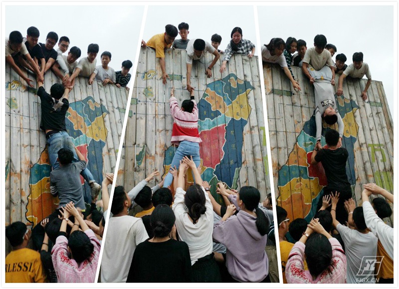 最后一个项目所有两委学生干部一起进行了毕业墙的活动,这需要大家一起考虑人力资源的合理分配、运用,第一个及最后一人怎样上墙都是所要考虑到的因素。这其中,大家的一些创造性思维、激进的想法不一定是坏想法,而最重要的是团结一致、紧密配合,要有战胜困难的团队精神。第一位同学在众人的托举下一跃而上,成功地拉开了序幕。接着,一个接一个,速度很快,最后一位同学由上面的同学将身体悬挂,其他伙伴们在墙头上拉着,全力“吊”起了,一个二十多人的团队完成此项活动仅仅用了不到十分钟。