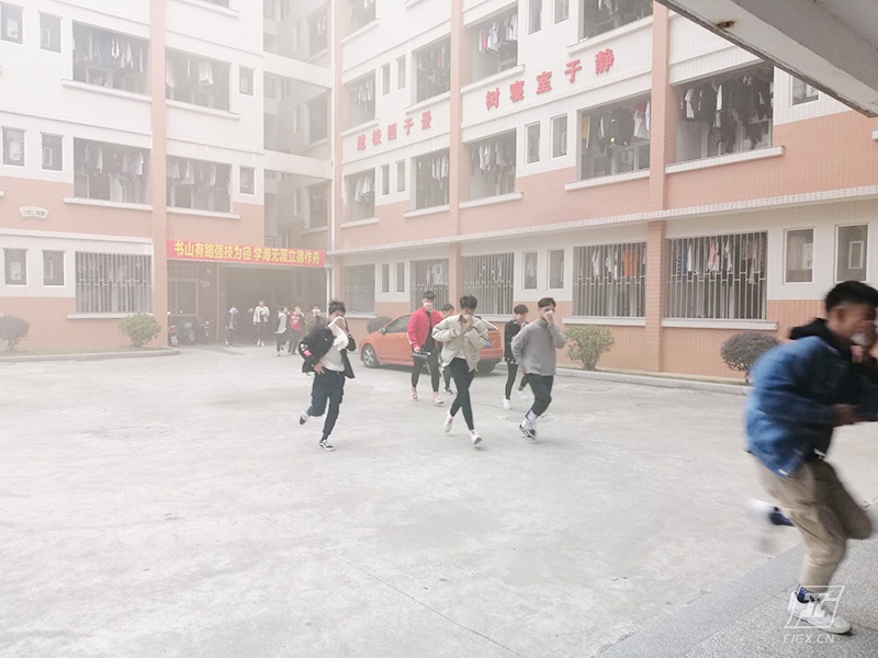 全体同学集合在田径场,由学生与保卫科刘洲副科长强调了演练的流程、逃生路线以及注意事项。同学们回到宿舍,随着警报声的响起,在老师的带领下,大家用湿毛巾、衣服等捂住口鼻,按照逃生演练方案设定的逃生路线,迅速而有序地从各宿舍楼撤离到指定位置。