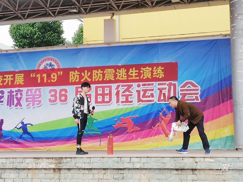消防演习过后是现场的灭火器灭火作业演习,学生与保卫科刘灿华老师通过现场展示向大家生动而详细地介绍了干粉灭火器的使用方法,面对火情,将灭火器取出适当摇匀,拔出栓销,距离1-2m将喷嘴对准火源根部喷射即可。