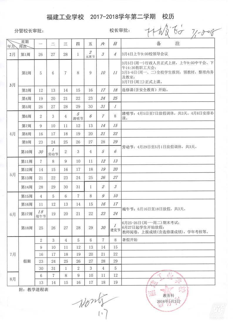 福建工业学校2017-2018学年第二学期教学校历