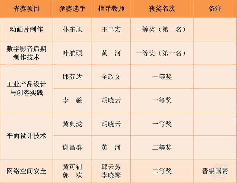 2018年12月,2019年福建省职业院校技能大赛在全省各地如火如荼展开。福建工业学校信息专业教学部认真组织动画片制作、数字影音后期制作技术、工业产品设计与创客实践、平面设计技术、网络空间安全五个项目参赛。经历四场地五场次的激烈角逐,选手们不负众望,共获得五个一等奖和两个二等奖,其中网络空间安全项目晋级全国职业院校技能大赛。