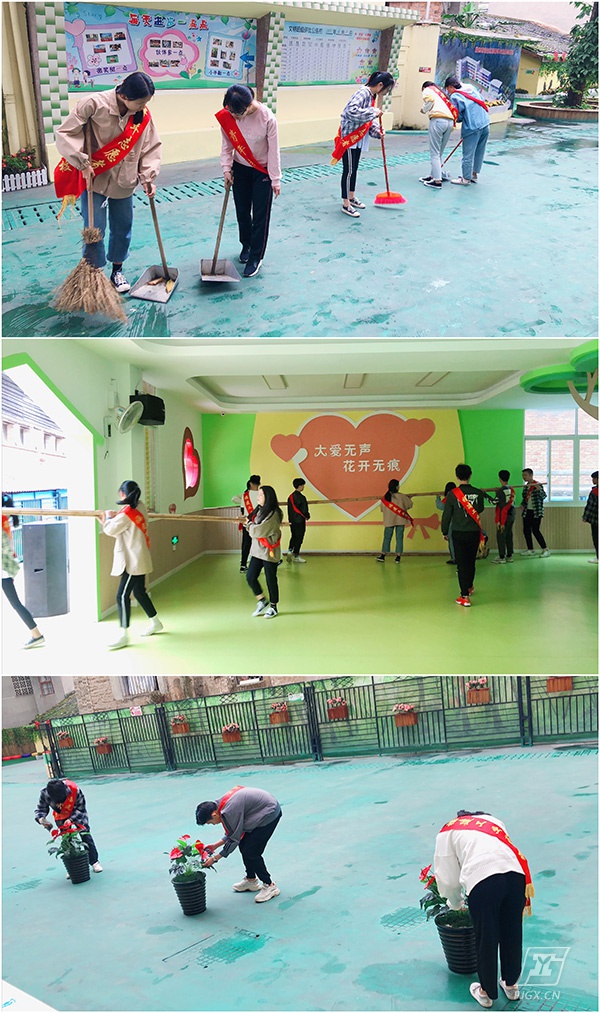 志愿者们一踏进培智学校大门,就受到了孩子们的热情欢迎。在培智学校徐老师的带领下,志愿者们一起参观了校园。随后徐老师说,今天志愿者的主要工作是将校园的各个角落打扫干净,帮忙将大课间表演道具布置好,并且在活动中和老师们一起组织好孩子们,保证大课间展示活动能够顺利进行。领到任务后,志愿者马上开始分组,在各个小组长的安排下,有的拿着劳动工具开始打扫,有的摆花盆,有的把一个个道具搬到指定位置。
