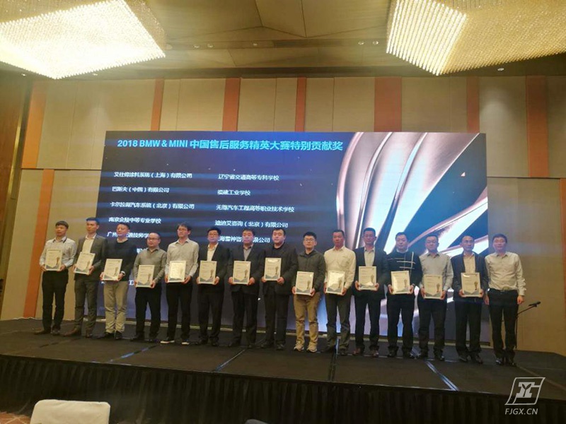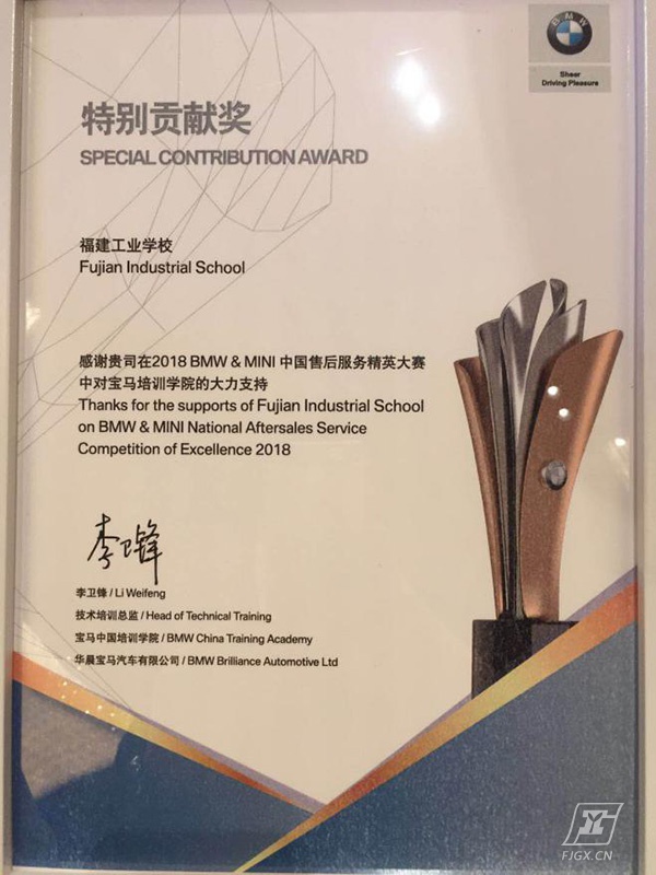 在颁奖典礼上,福建工业学校荣获2018年宝马技能大赛贡献奖,张江涛、高辉、邵鹭三位老师分别获得最佳BEST学员满意度奖、 学习先锋奖和5年长期服务贡献奖。
