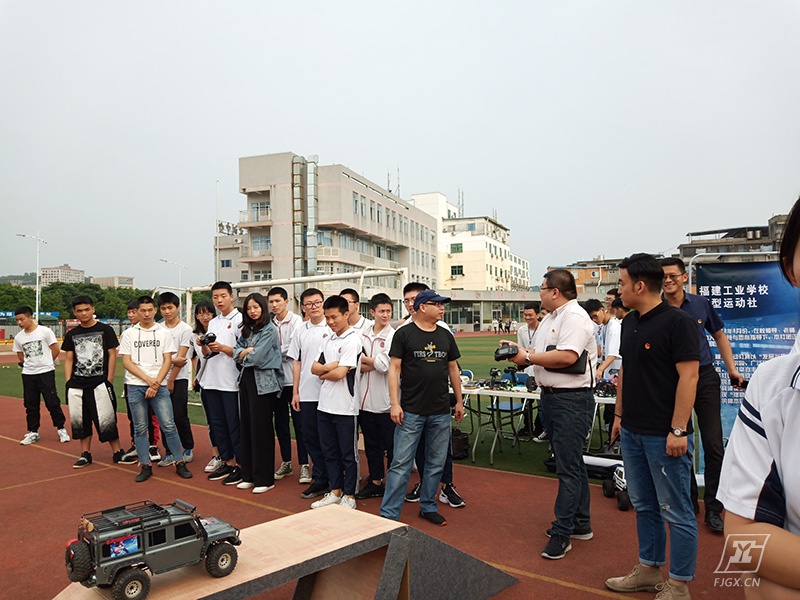 在宣誓结束后,领导及兄弟学校的新团员代表们一起来到田径场参观我校汽车模型社的活动。