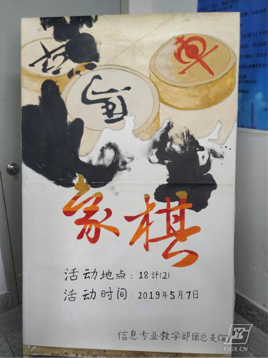 为给活动做出良好的宣传效果,信息科宣传部经过多日的努力,为本次比赛制作了精美的展板。展板融汇了中国象棋艺术的的精髓,利用鲜明的颜色对比,将“象棋”二字突出,点名主题。