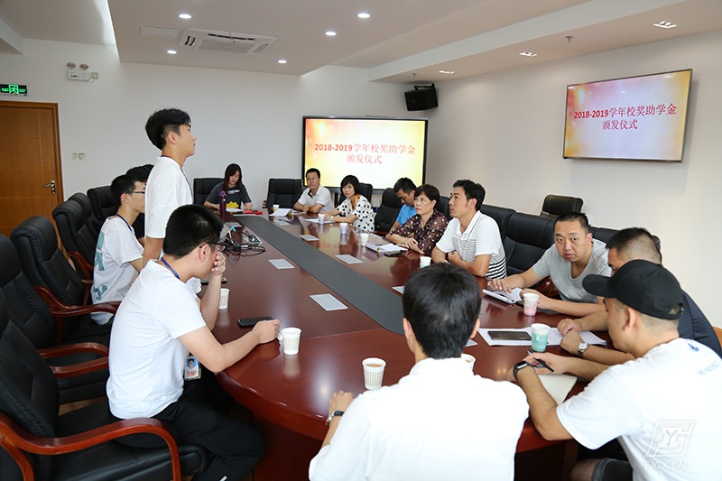 李旭东科长首先宣读了本次获得2018-2019学年校奖助学金学生名单。参会获奖学生依次做自我介绍,简要介绍家庭情况及在校表现。18汽修3班的马思榕作代表发言,他表示家庭虽没有给与他厚实的财富,但却给了他改变命运的品质,他体会到只有努力才有美好的未来,日后他将以 “团结勤奋,求实创新”的校训来鼓舞自己,努力学习,不忘母校恩!