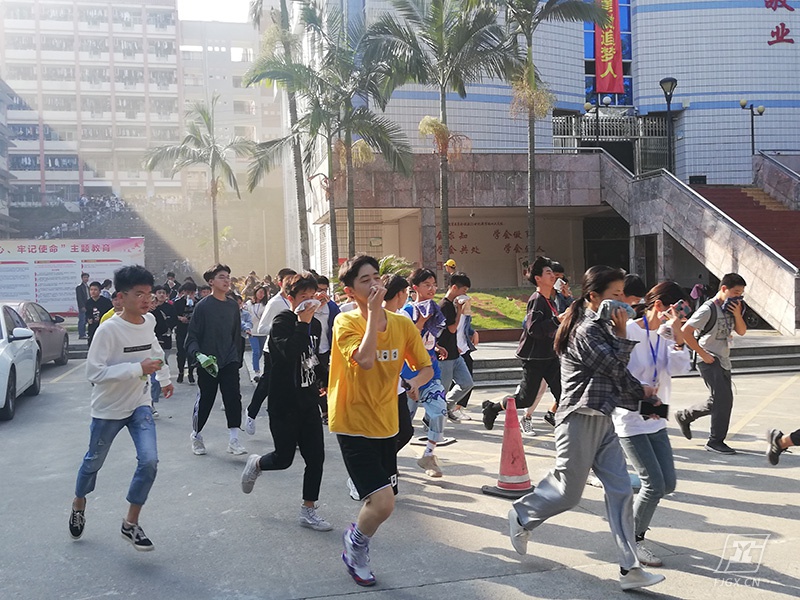 2019年11月8日,福建工业学校开展 “11.9” 应急逃生演练活动!火灾警报铃声响起,烟雾弹冒出浓烟,应急预案启动,逃生演练正式开始。