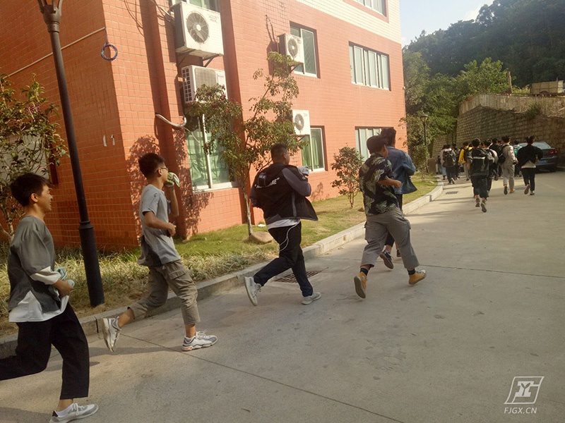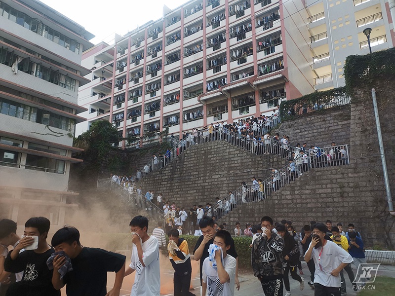 全体学生通过消防楼梯按照指定的疏散线路,用湿毛巾等防烟物品捂住口鼻,各出口执勤人员有序引导和指挥疏散,第一时间撤离到安全地带——田径场。