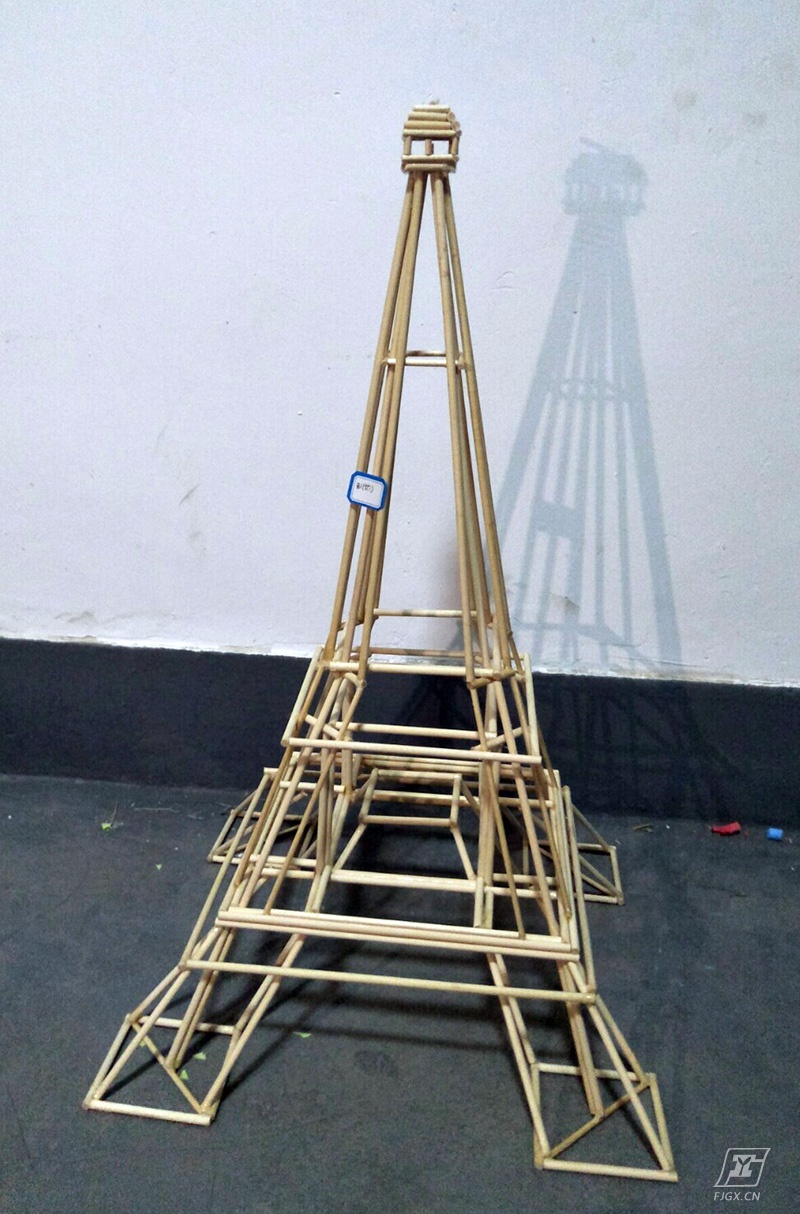 18计算机1班的环保作品,被他们用一根根木棍,进行创意,将一根根木棍进行裁剪拼接,变成了举世闻名的埃菲尔铁塔。细细观察,会发现他们把埃菲尔铁塔的精髓表现的淋漓尽致,栩栩如生。