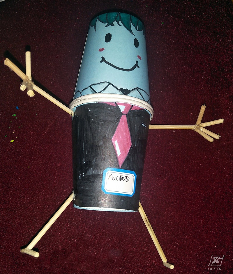 19数媒高职班的作品充满活泼可爱的形象,用两个纸杯和几根小棍黏贴在一起,使用五彩斑斓的色彩绘画成小人,简单又不失创意。