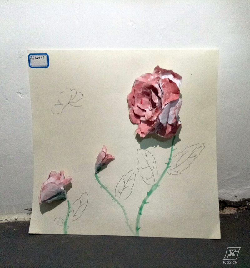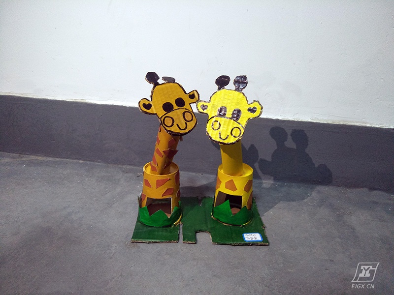 19平面设计2班的作品使用纸杯纸板绘画粘贴成长颈鹿,形象生动的描绘出长颈鹿的样子,让同学们感觉到了灵动、活泼,绘制出一幅机勃勃的场景。