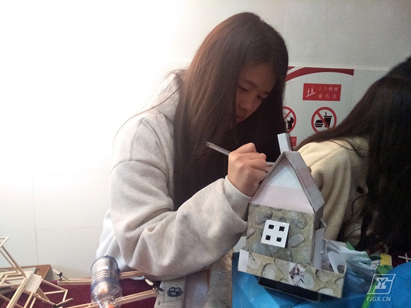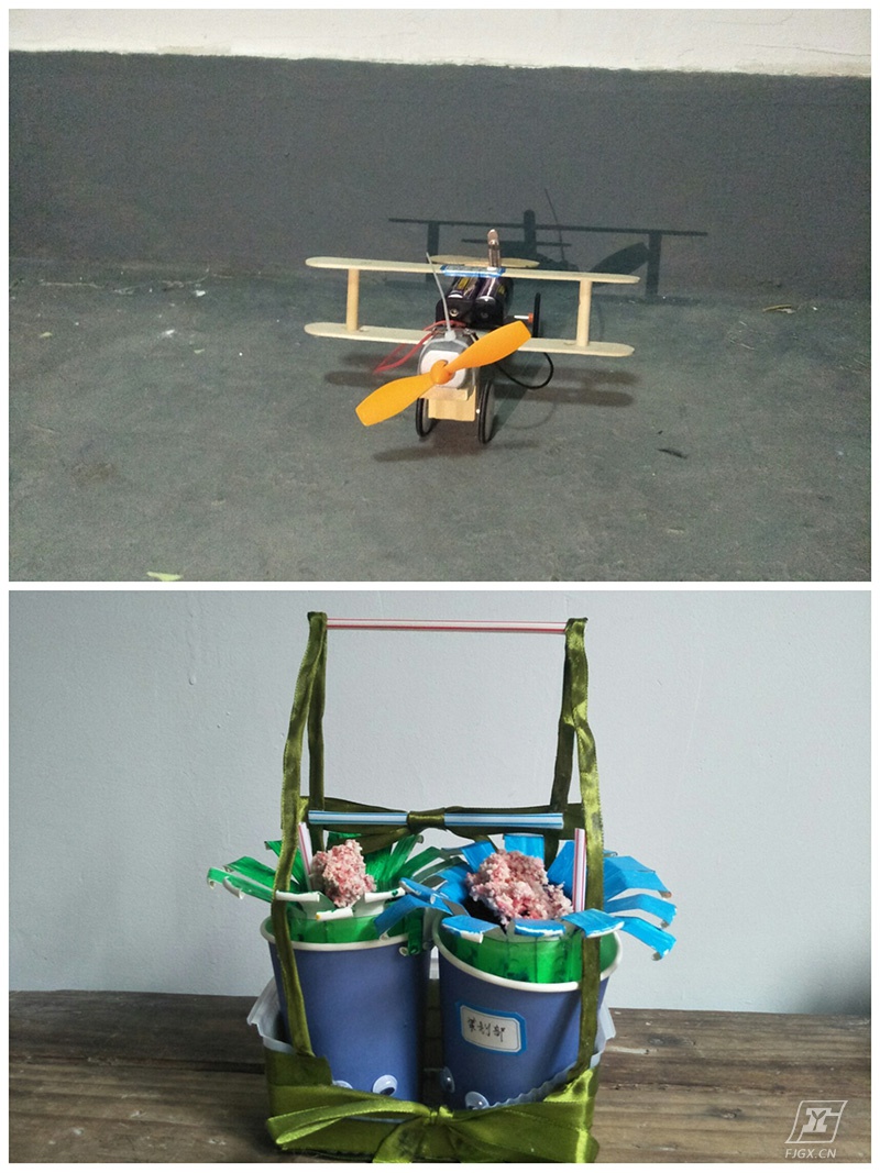 放置在比赛场地的作品之中,废报纸叠的花朵、废弃的易拉罐做的灯笼、木棍黏贴的房子……一件件同学们手工制作的废物利用作品被展示出来,让评委老师不断的为同学们的奇思妙想惊叹,也为其中体现的节能环保绿色思想主题而大加赞赏。