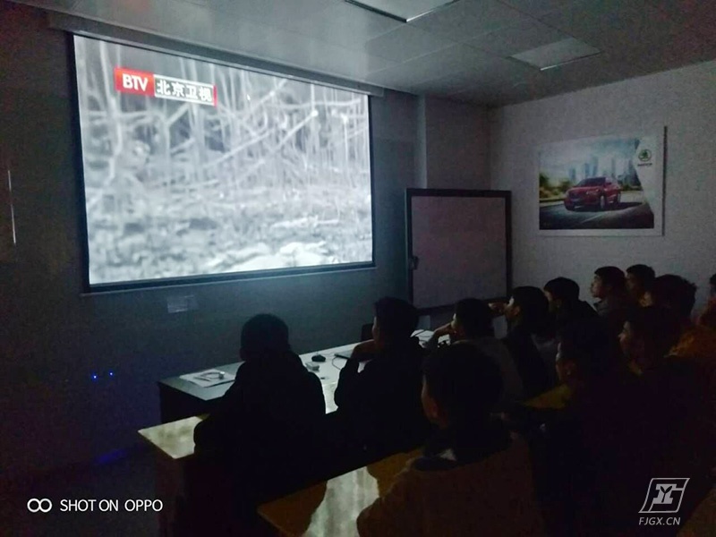 当天下午三点,汽车科主席团组织2018、2019级部分学生在大众第三教室观看南京大屠杀记录片《传递血证的人》。放映过程中全场肃穆安静,看到受难同胞的苦难经历同学们表情凝重。银幕中播放着一幕幕令人愤慨的屠杀场面和二战期间苦难同胞的受人残害和奴役的片段,黑白色调为主更显的森严悲壮。