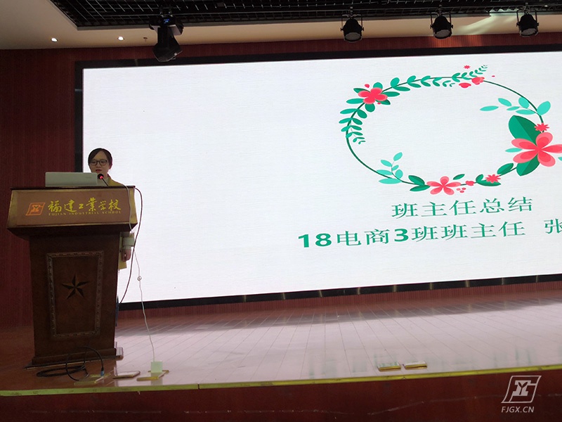 18电商3班的张志宏老师代表班主任团队上台分享了自己的带班心得。她从班委管理、班级活动、学生的成长几个方面,讲出了班主任们的心声。接下来,洪紫如老师上台做了总结性发言。她回顾了一个学期以来经贸专业教学部在学生管理方面的工作:班主任互助小组学习交流助力班主任团队建设;文化布置上墙,提升劳动卫生标准,营造优美温馨的学习环境;两委班委队伍培训提升战斗力;活动开展寓教于乐等。最后她结合学习小组工作的开展,分享了华体会平台“读书是为了什么”,为下学期的学业水平考试作动员。