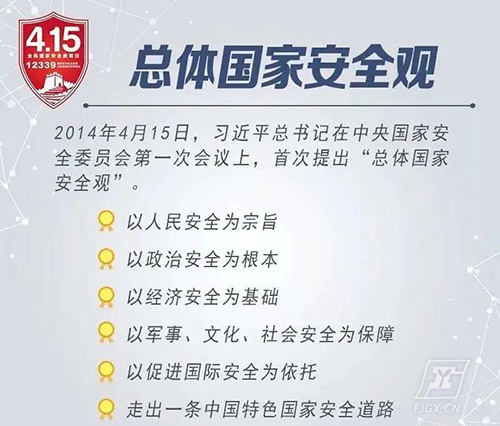 2014年4月15日,习近平在主持召开中央国家安全委员会第一次会议时提出,坚持总体国家安全观,走出一条中国特色国家安全道路。在这次会议上,习近平首次提出总体国家安全观,并首次系统提出“11种安全”。